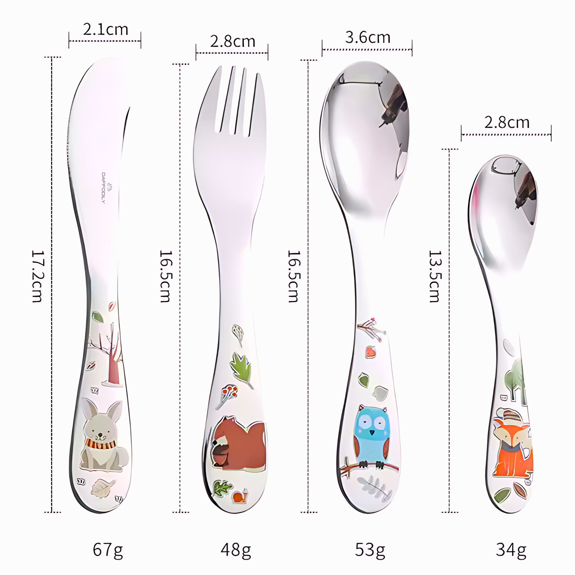 This kids cutlery set is made of 18/10 stainless steel and includes 4 pieces - a knife, fork, large spoon, and small spoon. The rounded soft edges and ergonomic design make it safe for children to use. The mirror finish makes it both aesthetically pleasing and rust/stain resistant. Adorned with cute animal characters, this BPA-free set is a beautiful and safe gift for children 1 year and older.
